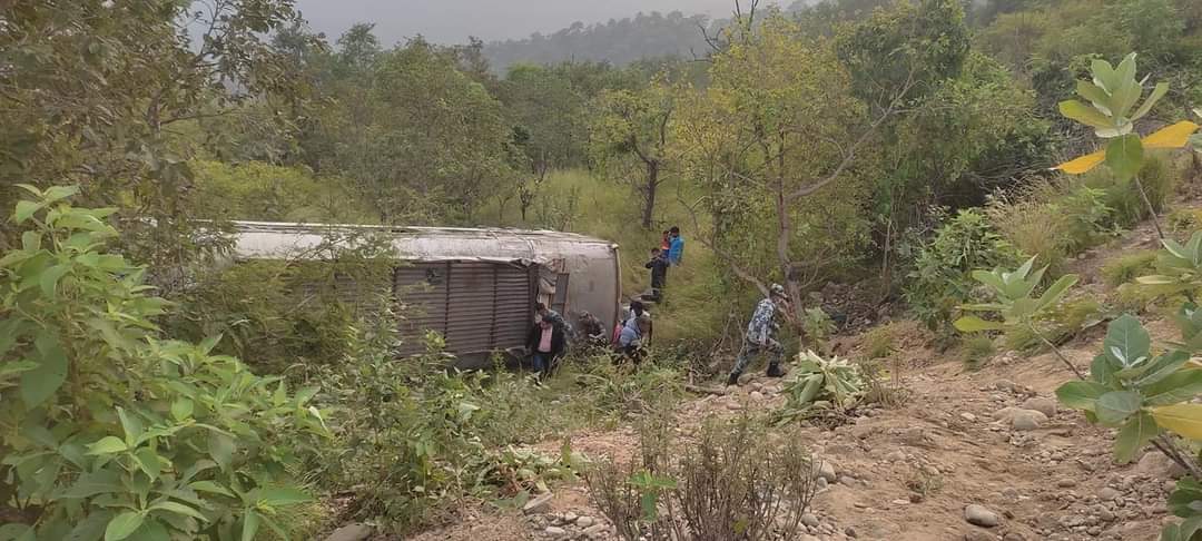 त्यस्तै गढवा गाउँपालिका वडा नम्बर ८ काेइलाबास चारखम्बा नजिकै ना ४ ख ४३५९ नम्बरको बस अनियन्त्रित भइ दुर्घटना हुँदा बसमा सवार २५ जना भन्दा बढि यात्रु घाइते भएको र एकजनाकाे अवस्था गम्भीर रहेको जिल्ला प्रहरी कार्यालय दाङले जानकारी दिएको हो ।