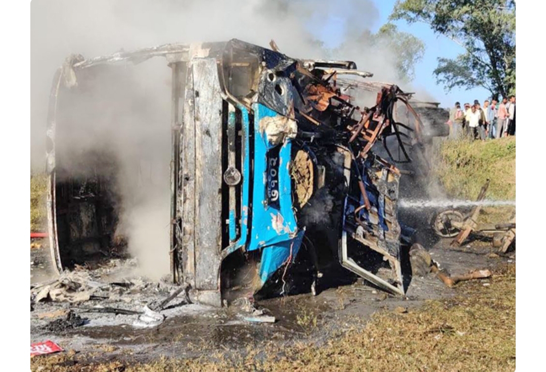 यस्तै बस सडकदेखि २० फिट तल खसेर दुर्घटना भएलगत्तै बसमा आगलागी भएको इलाका प्रहरी कार्यालय ढल्केबरका प्रहरी निरीक्षक प्रदीप सुवेदीले बताए । आगलागीपछि बस पूर्ण रुपले जलेर नष्ट भएको छ । दुर्घटनापछि बसका चालक सप्तरीको छिन्नमस्ता गाउँपालिका ५ निवासी ४० बर्षीय भगवतीप्रसाद कर्ण र सहचालक सम्पर्कमा नरहेको र उनीहरुको खोजी कार्य जारी रहेको प्रहरीले बताएको छ ।