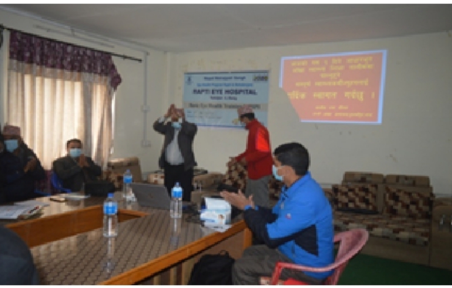 यसै गरी ४ गते मुसिकोट नगपालिका रुकुम पश्चिमका विभिन्न स्वास्थ्य संस्थाका १९ जना स्वास्थ्यकर्मीहरूलाई आधारभूत आँखा स्वास्थ्य शिक्षा तालिम सम्पन्न भएको छ । नेपाल नेत्र ज्योति सङ्घ, रुकुम पश्चिमका सभापति शिवराम खत्रीको सभापतित्व, मुसिकोट नगरपालिकाका प्रमुख देवीलाल गौतमको प्रमुख आतिथ्यमा सम्पन्न उक्त तालिममा प्रमुख अतिथिको आसनबाट बोल्दै प्रमुख गौतमले राप्ती आँखा अस्पतालले रुकुम पश्चिमको मुसिकोटमा सञ्चालन गरेको आँखा उपचार केन्द्रलाई स्तरोन्नति विकास गर्न आफू तयार रहेको बताउँदै यस्ता तालिमहरूले स्वास्थ्य संस्थामा आउने आँखाका बिरामीहरूलाई महत्त्वपूर्ण योगदान दिने विश्वास व्यक्त गर्नु भयो ।