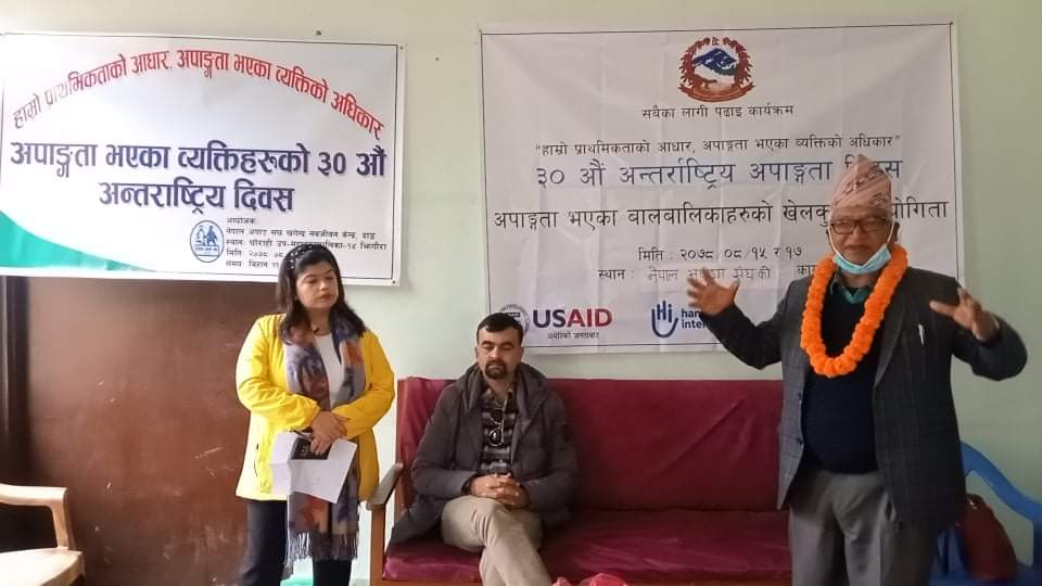 समावेशीकरण परिवार, मूलधारका कार्यक्रमहरुमा, राज्यले बनाउने नीतिहरुमा, संस्थाहरुले वनाउने योजनामा, राजनीति, विकासका नीतिहरुमा अपांगता भएकाहरुको समान अधिकार र पहुँच अभिवृद्धिमा राज्यले गम्भीरतापूर्वक ध्यान दिनुपर्ने भन्दै विषयबस्तुमाथि संघका सदस्य बिबेक खड्काले विषयबारे प्रकाश पार्नुभएको थियो । कार्यक्रममा आधाभूत विद्यालय बालमन्दिरकी श्रोत शिक्षक पुष्पा दाहाल,पूर्व अध्यक्ष कृष्ण चौधरी, संघका कोषाध्यक्ष बसन्तराज भट्टलगायतले शुभकामना मन्तव्य राख्नुभएको थियो ।