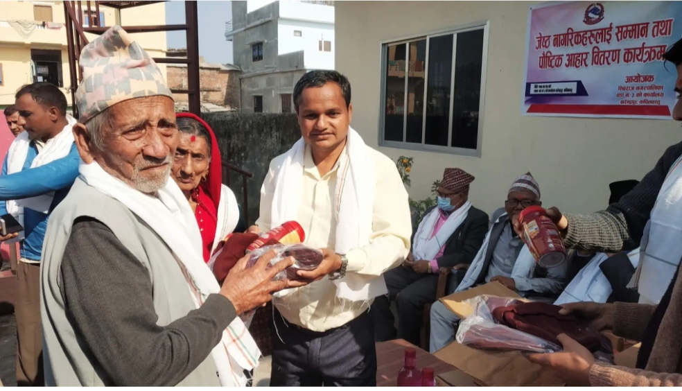 वडा कार्यालय परिसरमा एक कार्यक्रमका बीच जेष्ठ नागरिकलाई सम्मान तथा पौष्टिक आहार प्रदान गरेको छ । शुक्रबार वडा कार्यालय खरेन्द्रपुरमा शिवराज नगरपालिकाका प्रमुख नेत्रराज अधिकारीले ८० वर्ष उमेर पुरा गरेका जेष्ठ नागरिकलाई खादा ओढाई उक्त सामग्रीहरू प्रदान गरी सम्मान गर्नु भएको हो ।