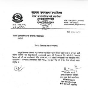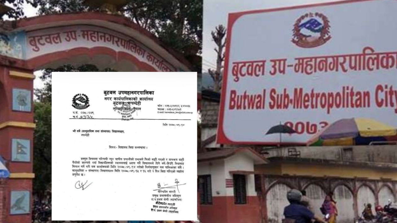 रूपन्देही । वर्षासँगै चिसो बढेपछि बुटवल उपमहानगरपालिकाले २ दिनका लागि शैक्षिक संस्थाहरु बन्द गर्न आह्वान गरेको छ ।