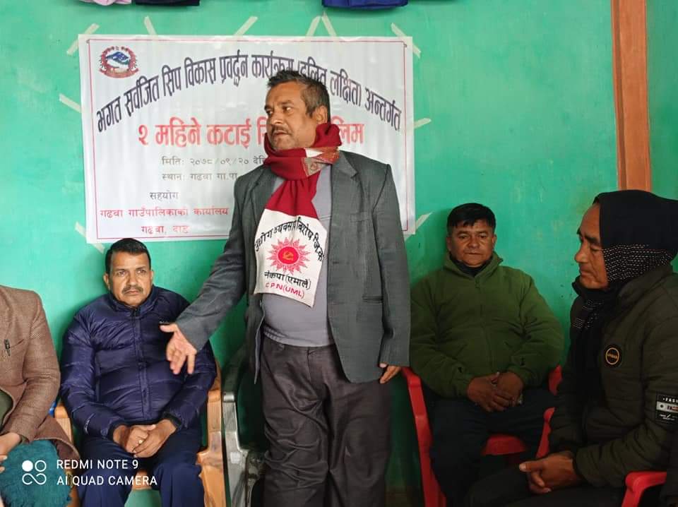 यहि पुष २० देखि सुरु भएको एड्भान्स डिप्लोमा तहको सिलाई कटाई फागुन १९ गते सम्म संचालन गरिने बताइएको छ । तालिममा काम सिकेर पेशा ब्यवसाय संचालन गरेका २० जना दलित वर्गका ब्यवसायीहरु सहभागि हुनु भएको छ । तालिम सिकाएर सबै सहभागिहरुलाइ एक–एक थान मसिन समेत प्रदान गरिने कार्यक्रमको लक्ष रहेको घरेलु कार्यालयले जनाएको छ । स्थानीय समाजसेवी रेशम बहादुर शाहीको स्वागत मन्तब्यबाट सुरु भएको तालिम उद्घाटन कार्यक्रमको संचालन घरेलु तथा साना उद्योग कार्यालयका अधिकृत बिक्रम केसीले गर्नुभएको थियो ।