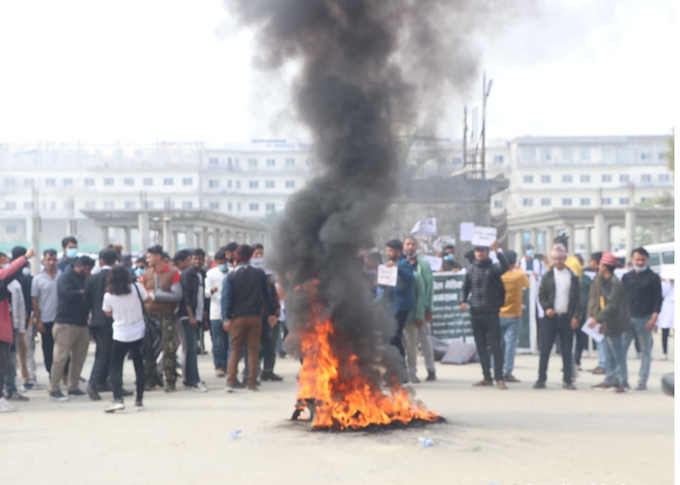 आइतबार रिले अनसनका लागि पुगेका विद्यार्थीहरुलाई नोबेल प्रशासनले रोकेपछि विद्यार्थीहरुले मंगलबार टायर बालेर प्रदर्शन गरेका हुन् । यसअघि विद्यार्थीहरुले नोबेल मेडिकल कलेजमा तोडफोड गरेका थिए ।