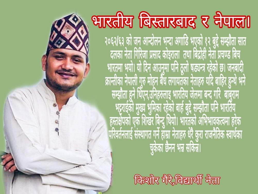 अब कुरा गरौ सिमा विवादको! सिमा बिवाद नेपालमा सदैब सत्ता आरोहणको बुदा बनेको छ। सिमा बिवाद किन छ? के यो हल हुन नसक्ने हो? अवश्य नि न सक्ने चाहिँ होइन, यो हल गर्न सकिन्छ। तर नेपाली नेताहरुमा त्यो आत्मबिश्वास नै छैन। सिमा बिवाद किन यतिका लामो समय देखि रहिरहेको छ। सोचौ त, भारतको कारणले रहेको छ कि? नेपालको? नेपाल कै कारणले रहेको छ। जब भारत नेपालको सिमा बिवाद मिलाउने कार्य हुन्छ तब नेपालले भुमी गुमाउनु पर्ने अनि केही भुमी प्राप्त गर्ने हुन सक्छ अनि नक्सामा केही परिवर्तन आउनु साथ नेपालि जनता बाट बहिस्कार हुने डरले कुनै नेताले यस बिवादलाई सुल्झाउने प्रयास नै गर्दैन। जब कुटनैतिक प्रयास नेपालले गर्न सक्दैन, भारतको बलमा आएको ब्यबस्था अनि भारत कै बलमा सत्ताको स्वाद चाखेका हरुले कसरी नेपालको स्वभिमानको रक्षा गर्न सक्छन? सक्दैनन! भारत एकदम ढुक्क छ, नेपालका नेतृत्व भारत प्रती बफादार छन भनेर! भारत हरेक भारत बिरोधि सम्भाबित गतिबिधीलाई यसरि बदनाम गराई सकेको छ कि अब फेरि कोहि भारत विरुद्ध आवाज उठाउछ भने जनताले पत्ताउन नसक्ने अवस्था निर्माण गरिसकेको छ। सुरुङ्ग युद्ध गर्छु भनेर जनता उक्साउने माओबादीलाई सन्सदिय सत्ताका भुरुङ्ग नचाए झै नचाईदियो कि माओबादीको नामो सिशान नै मेटियो। किन यो भयो त भन्दा भारत बिरोधि अर्को संघर्ष नेपालमा सुरु न होस भनेर भारतले माओबादीहरुलाई एन्टि भारत कार्डका रुपमा मलजल गरि ती भावनालाई तुहाउने काम पनि भारतले नै गर्यो।