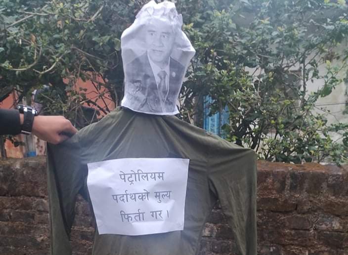 रुपन्देही । नेकपा एमाले निकट विद्यार्थी संगठन अनेरास्ववियु रुपन्देही जिल्लाले पेट्रोलियम पदार्थको मूल्य वृद्धि विरुद्धमा बिहीबार बुटवलमा प्रधानमन्त्री शेरबहादुर देउवाको पुतला दहन गरेको छ ।