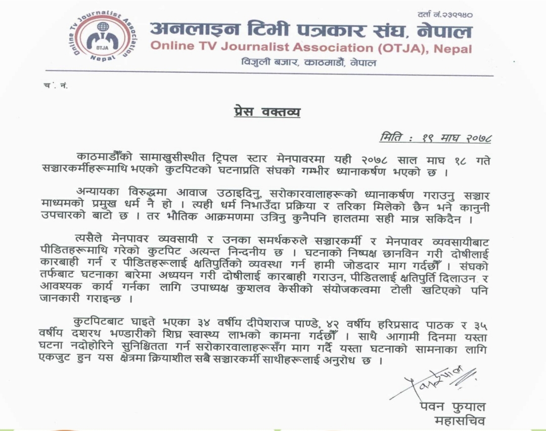 काठमाडौं । काठमाडौंको सामाखुसीस्थीत ट्रिपल स्टार मेनपावरमा यही २०७८ साल माघ १८ गते सञ्चारकर्मीमाथी भएको कुटपिटको घटनाप्रति संघको गम्भीर ध्यानाकर्षण भएको छ ।