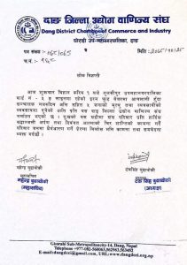दाङ । तुलसीपुरमा भएको घटना प्रति दाङ जिल्ला उद्योग वाणिज्य संघले दुख व्यक्त गरेको छ । संघले शुक्रवार एक विज्ञप्ती जारी गरेर दुख व्यक्त गरेको हो ।