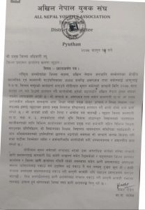 प्यूठान । राष्ट्रीय जनमोर्चाको भातृसंगठन अखिल नेपाल युवक संघ प्यूठानले प्रमुख जिल्ला अधिकारीलाई बुधबार ध्यानकर्षण पत्र बुझाएको छ । गत फागुन ९ गतेको मल्लरानी गाउपालिका प्यूठानका अध्यक्ष अमरध्वज राणा , प्रमुख प्रशाासकिय अधिकृत बालकृष्ण थापा , शिक्षा शाखाका प्रमुख ठाकुर आचार्य र शिक्षा बिकास तथा समन्वयन इकाइ समितिका प्रमुख शिबराज पण्डितलाई हातपात गरि कालोमोसो दलेको घटना प्रति अखिल नेपाल युवक संघ प्यूठानका अध्यक्ष कमल पौडेल लगाएतको टोलिले प्रमुख जिल्ला अधिकारी खिमराज भुषाललाई ध्यानाकर्षण पत्र बुझाएको हो ।
