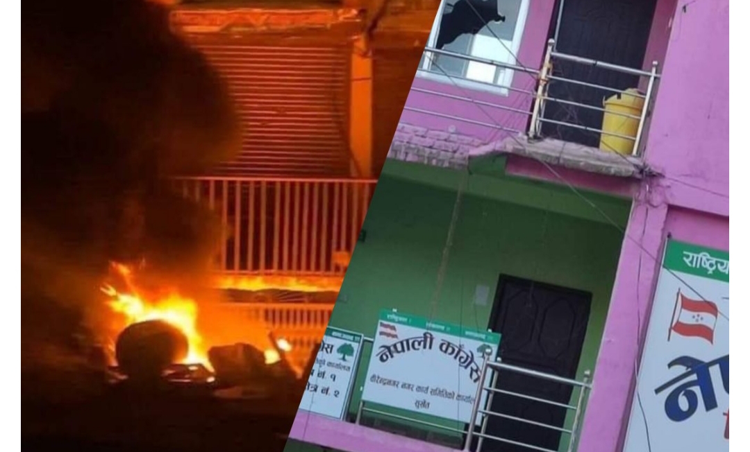 सुर्खेत । बिहानैदेखि बन्दले प्रभावित बनेकाे सदरमुकाम वीरेन्द्रनगर स्थित नेपाली काङ्ग्रेस, नेकपा माओवादी केन्द्र र नेकपा एमालेको पार्टी कार्यालयमा बन्द कर्ताले तोडफोड र आगजनी गरेका छन् ।