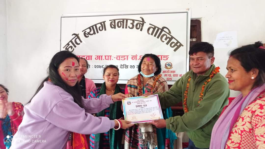 दाङ । गढवा गाउँपालिकाले बिपन्न र सिमान्तकृत बर्गका बिभिन्न समुदायका ३० जना महिलाहरुलाई हातेब्याग बनाउने तालिम सिकाएको छ । बजारमा महंगो मुल्यमा किन्नुपर्ने हातेब्याग आफैले बनाउन सक्ने सिप सिकेपछि महिलाहरुले सिपबिकास गरेर स्वरोजगार बन्न सकेको बताएका छन् । गढवा गाउँपालिका महिला तथा वालवालीका शाखाको २ लाख र वडानं.६ को एकलाखको लागतमा १५ दिने हातेब्याग बनाउने तालिमको आयोजना गरिएको वडा अध्यक्ष बालचन्द्र ठकूरी हमालले बताउनुभयो । यसैबिच शुक्रवार एक कार्यक्रमका बिच उक्त सिपमुलक तालिमको समापन गरिएको छ ।