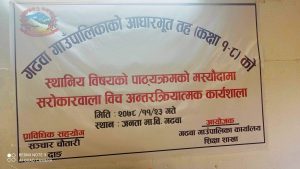 दाङ । गढवा गाउँपालिकाले गाउँपालिका भरका आधारभूत तह (कक्षा १ देखि ८ सम्म) स्थानीय बिषयको पाठ्यक्रम तयार गर्न संचार चौतारी दाङले तयार गरेको मस्यौदा माथी आइतवार बृहत छलफल र सुझाव संकलन गरेको छ । गढवा गाउँपालिकाका अध्यक्ष सहजराम यादवको अध्यक्षतामा भएको कार्यक्रममा संचार संचारी दाङका सुदर्शन रिजालले स्थानीय पाठ्यक्रमको मस्यौदा प्रस्तुत गर्नुभएको हो ।