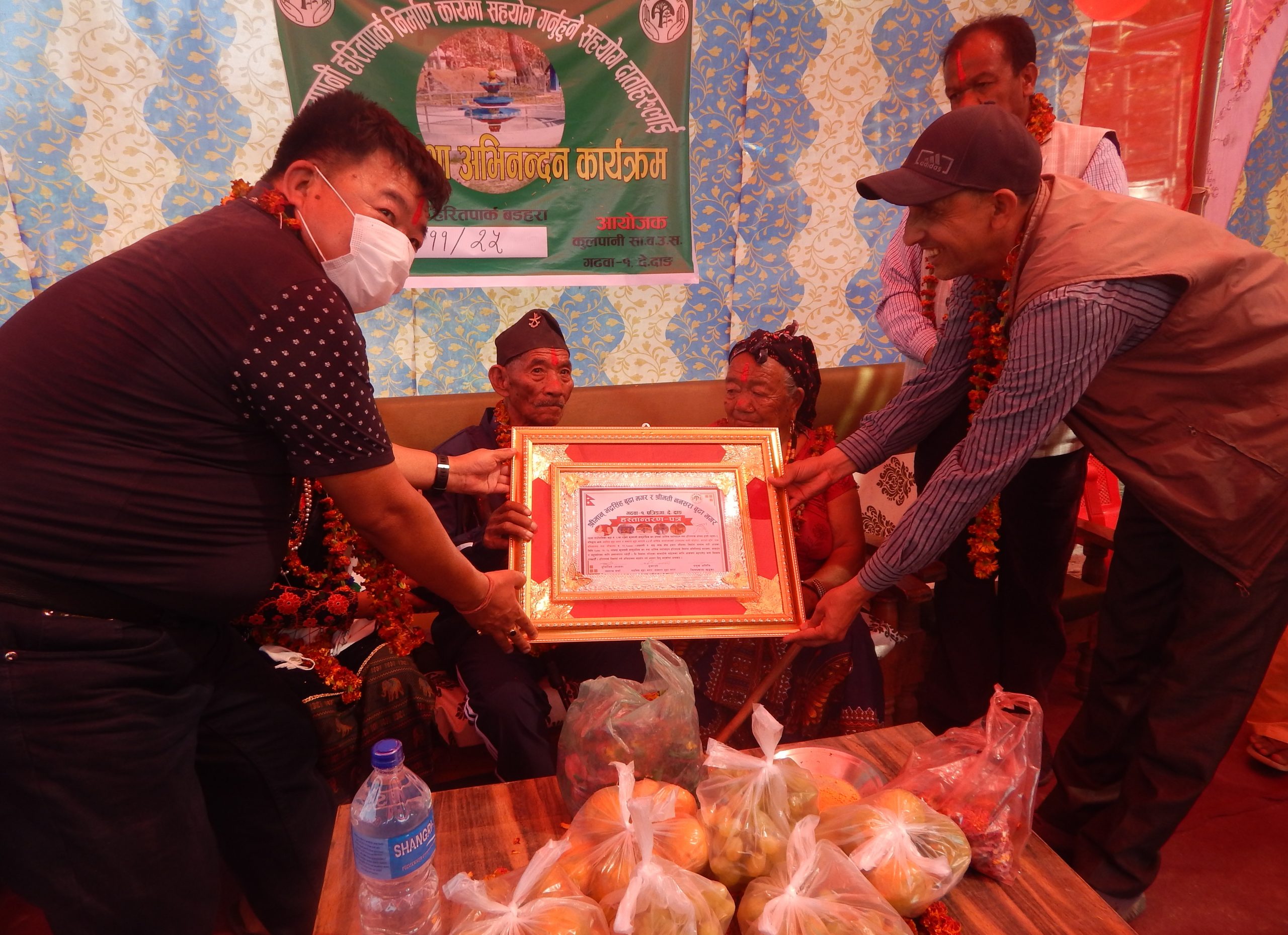 सो अवसरमा आयोजकले खगेन्द्र बुढा मगरका ८४ वर्षीय बुवा भद्र सिं बुढा मगर,आमा नन्सरा बुढा मगरलाई सम्मान पत्र सहित अबिर,फुलमा एवं दोसल्ला ओढाएर भव्य सम्मान तथा अभिनन्दन गरेको थियो भने कार्यक्रममा सहभागी सम्पूर्ण घरपरिवारलाई समेत सम्मान गरेको थियो ।