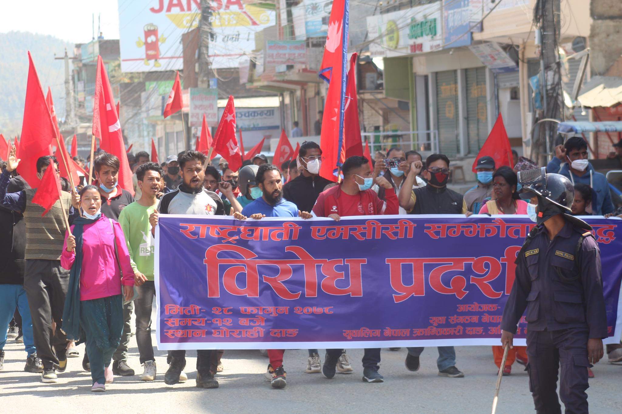 दाङ । दाङमा अखिल नेपाल युवक संघ, युवा संगठन नेपाल र युवालिग नेपाल क्रान्तिकारीले संयुक्त रुपमा घोराहीमा विरोध प्रदर्शन गरेका छन् ।
