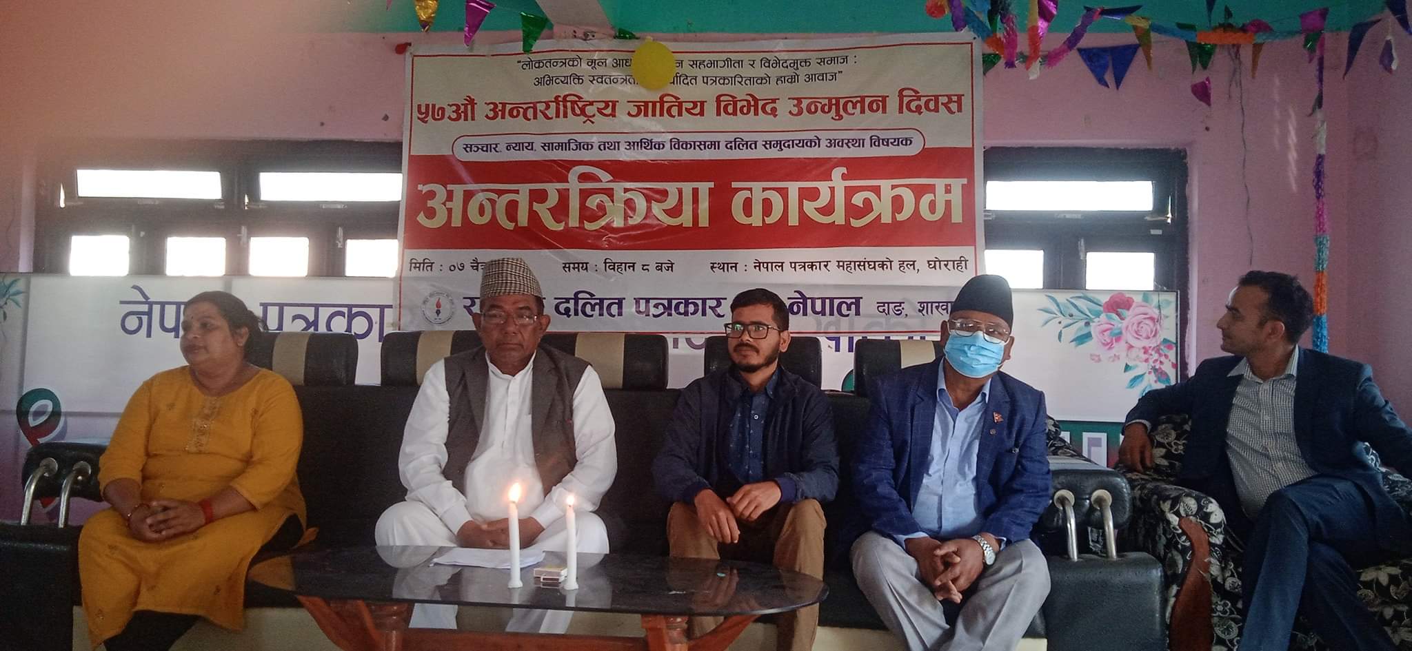 दाङ । ५७ औँ अन्तर्राष्ट्रिय जातीय विभेद उन्मुलन दिवसको सन्दर्भमा राष्ट्रिय दलित पत्रकार संघ दाङले सञ्चार, न्याय, सामाजिक तथा आर्थिक विकासमा दलित समुदायको अवस्था विषयक अन्तरक्रिया कार्यक्रम गरेको छ ।