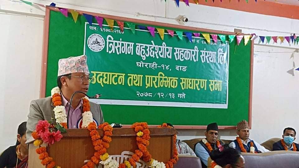 आज घोराहीमा त्रिसंगम बहुउद्देश्यीय सहकारी संस्था लिमिटेडको उद्घाटन तथा प्रारम्भिक साधारण सभामा उहाँले समाजको जिवनप्रणालीलाई परिवर्तन गर्न आत्मनिर्भर अर्थतन्त्रको विकासले महत्वपुर्ण भुमिका खेल्ने बताउनुुभयो ।