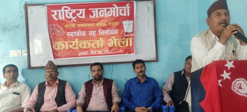 त्यसैले राष्ट्रिय जनमोर्चाका कार्यकर्ताले जनताको चेतना उठाउन ध्यान दिन जरुरी छ । अखिल नेपाल युबक संघका पुर्ब केन्द्रिय अध्यक्ष कासिनाथ पोख्रेलले कम्युनिस्टको लागि निर्वाचन आन्दोलनको मोर्चा हो भन्नुभयो । राष्ट्रिय जनमोर्चाका केन्द्रिय सदस्य तथा जिल्ला अध्यक्ष गणेश आचार्यले निर्वाचनबाट बिजय हासिल गरेर जनताको मालिक बन्नेहरुलाइ पराजित गरि जनताको सेबक बन्नको लागि राष्ट्रिय जनमोर्चाका उम्मेदवारलाई बिजयी गराउनु पर्ने कुरा बताउनु भयो । नगर अध्यक्ष हरी खरेलको अध्यक्षतामा भएको भेलामा राष्ट्रिय जनमोर्चाका जिल्ला सदस्य सुशील पोख्रेलले निर्वाचनको कार्यक्रम प्रस्तुत गर्नु भएको थियोे ।