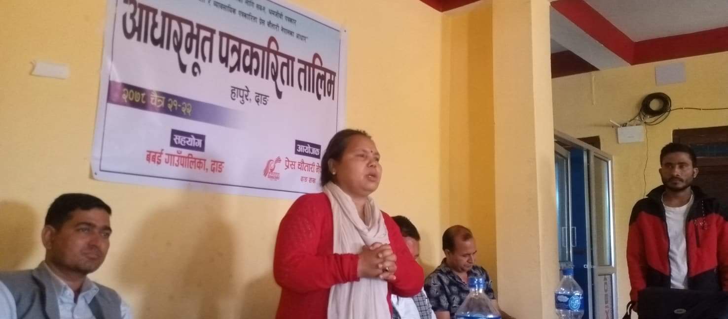प्रेस चाैतारी दाङका अध्यक्ष इन्द्र डिसीकाे अध्यक्षता तथा बबई गाउँपालिका उपाध्यक्ष सावित्रा विककाे प्रमुख आतिथ्यतामा भएको उदघाटन कार्यक्रममा प्रेस चाैतारीले एक वडा दुई पत्रकार अभियानलाई सफल बनाउन र मर्यादित पत्रकारिताकाे विकासका लागि आधारभूत पत्रकारिता तालिम दिन लागिएको बताईएकाे छ ।