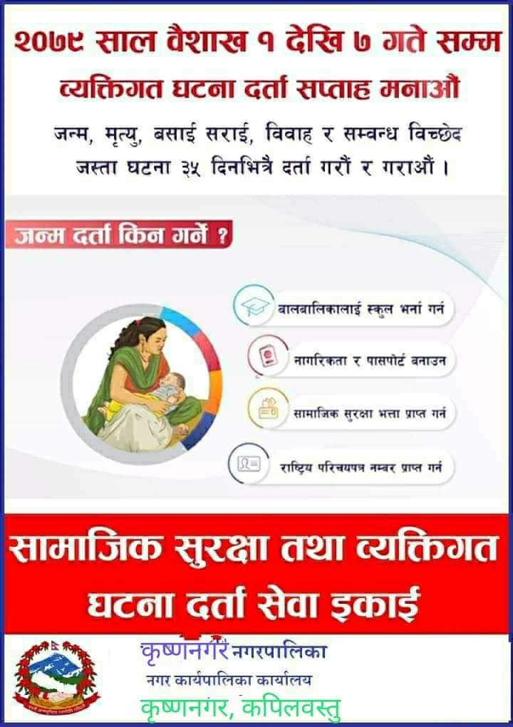 कपिलवस्तु ।कपिलवस्तु जिल्लाको कृष्णनगर नगरपालिकाले राष्ट्रीय व्यापी कार्यक्रम अन्तर्गत व्यक्तिगत घटना दर्ता सप्ताह १-७ गते सम्म मनाउने भएको छ ।