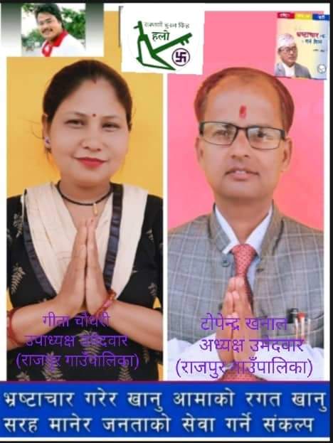 अहिलेको समयमा स्थानिय सरकार प्रमुखको निकै नै ठूलो भुमिका रहेको र उक्त भुमिका निर्वाह गर्न दक्ष उमेदवारको आवश्यकतालाई मध्यनजर गर्दै राजनिती शात्रबाट स्नातकोत्तर तह (एमए) उपाधी पाएका लामो समय सम्म शिक्षा क्षेत्रमा काम गर्दै आएका र पालिका भित्र रहेका विभिन्न प्रकारका नागरिकका समस्याहरुलाई सम्बोधन गर्नका निम्ति पत्रकारिता मार्फत सम्बन्धित निकायलाई दबाब दिदै नागरिकका पक्षमा आवाज उठाउदै आएका बौद्धिक ब्यक्ती टोपेन्द्र खनाललाई अध्यक्ष पदमा र चौधरी जातीको बाहुल्यता भएको क्षेत्र भएको र उपाध्यक्ष पद निकै जिम्मेवार पद भएकोले कक्षा १२ उत्तीर्ण गरेकी गीता चौधरीलाई उपाध्यक्ष पदकालागि पार्टीले चुनाबी मैदानमा अघि सारेको पार्टीका क्षेत्रीय अध्यक्ष लिला यादवले जनाउनु भएको छ । राजपुरको उपाध्यक्ष पदमा सबै पार्टीले यादवलाई अघि सारी रहेको भएपनि यस पार्टीले भने चौधरीलाई ग्राहयता दिएको पाइएको छ ।