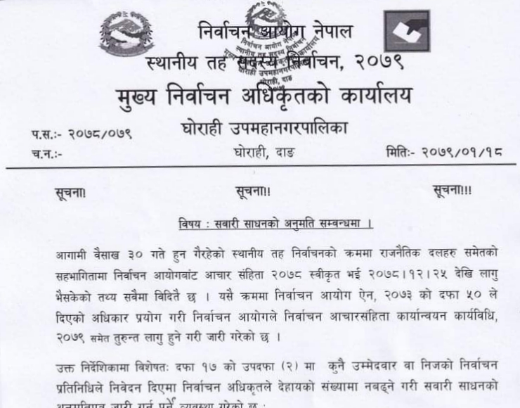 उम्मेदवारहरुले आफु प्रचारमा हिड्ने गाडीहरुको अनुमती नै नलिएर चलाइरहेको सूचना आएको भन्दै निर्वाचन आचारसंहिताको पालना गर्न र गराउन उम्मेदवार तथा पार्टीहरुलाई सचेत बनाएको छ ।