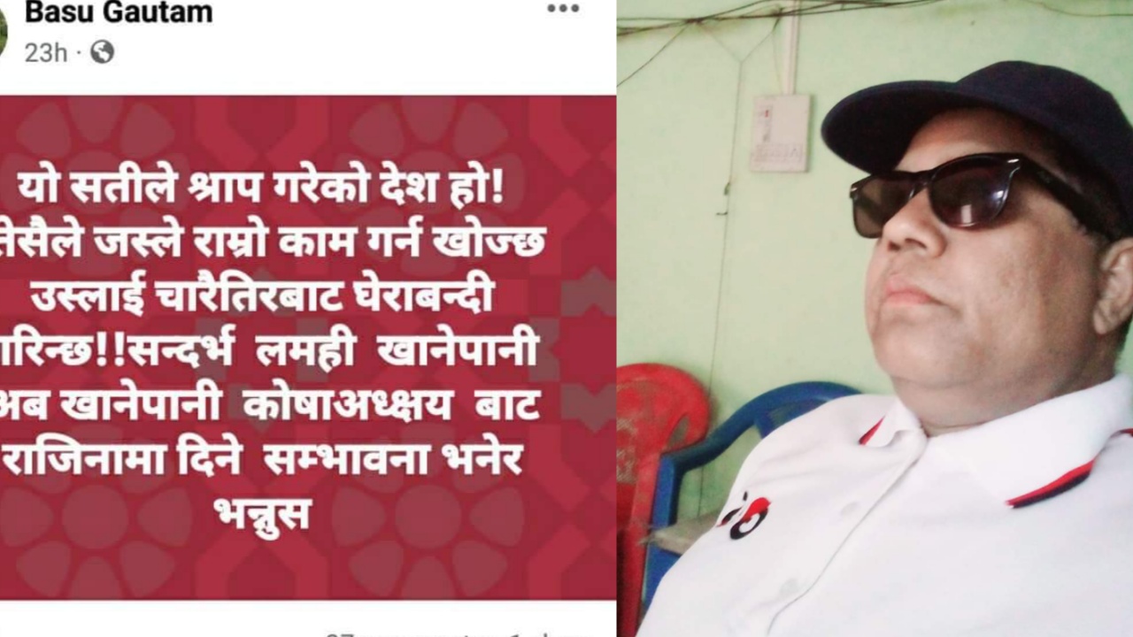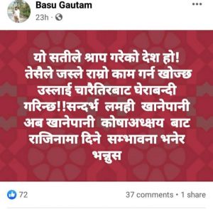 उनले आफ्नो फेसबुक स्टाट्समा लेखेका छन् “यो सतीले श्राप गरेको देश हो!तेसैले जस्ले राम्रो काम गर्न खोज्छ उस्लाई चारैतिरबाट घेराबन्दी गरिन्छ!!सन्दर्भ लमही खानेपानी अब खानेपानी काेषाअध्क्षयबाट राजिनामा दिने सम्भावना भनेर भन्नुस”भनेर लेखेका छन् । हेर्नुस् स्टाट्समा