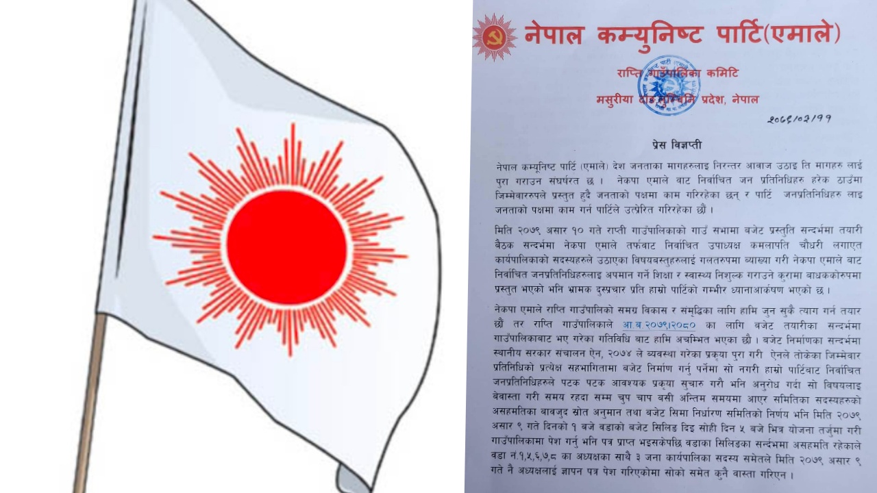 आर्थिक वर्ष २०७९/०८० को बजेट प्रस्तुत गर्ने विषयमा गाउँपालिकाको विषयगत क्षेत्रको आधारमा सन्तुलित विकास बजेट विनियोजन गर्नुपर्नेमा हचुवाको भरमा बजेट सिलिङ्ग निर्धारण गरिएको एमाले राप्ती गाउँपालिका कमिटीका अध्यक्ष मदन अधिकारीले विज्ञप्ती मार्फत स्पष्ट पार्नु भएको छ ।