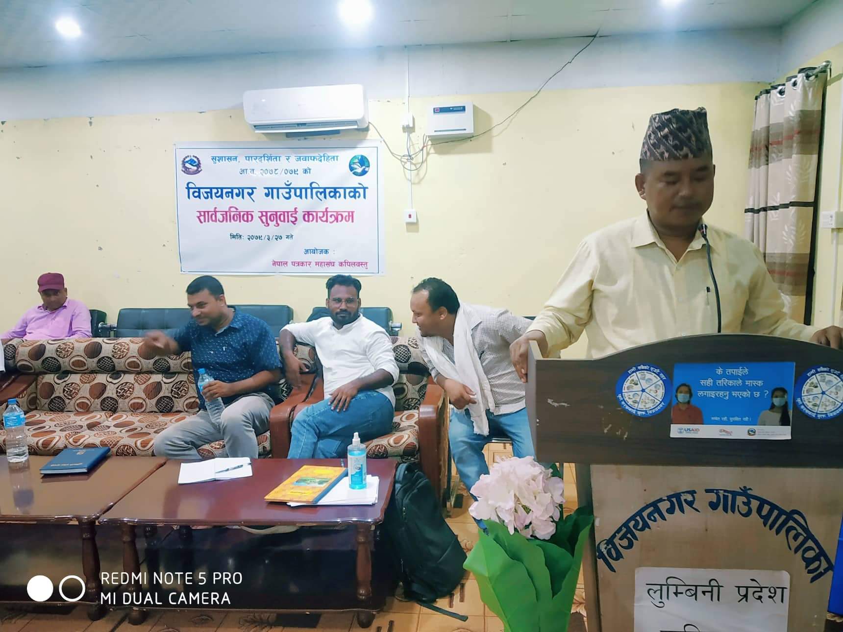 गाउँपालिकाको सु–शासन, पारदर्शिता र जवाफदेहिताका लागि नेपाल पत्रकार महासंघ कपिलवस्तुको समन्वय र विजयनगर गाउँपालिकाको सहयोगमा आर्थिक वर्ष ०७८/०७९ को सार्वजनिक सुनुवाई कार्यक्रम भएको हो ।