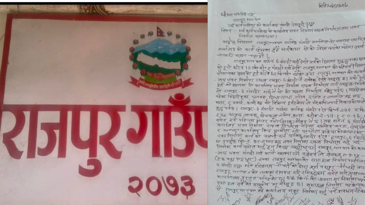 दाङ । देउखुरीको राजपुर गाउँपालिकाको प्रशासनिक कार्यालय भवन पायक पर्ने ठाउँमा राख्नुपर्ने माग राख्दै वडा नम्बर ५,६ र ७ द्वारा गठित संघर्ष समितिले राजपुर गाउँपालिकालाई सोमबार ज्ञापन-पत्र हस्तान्तरण गरेको छ ।