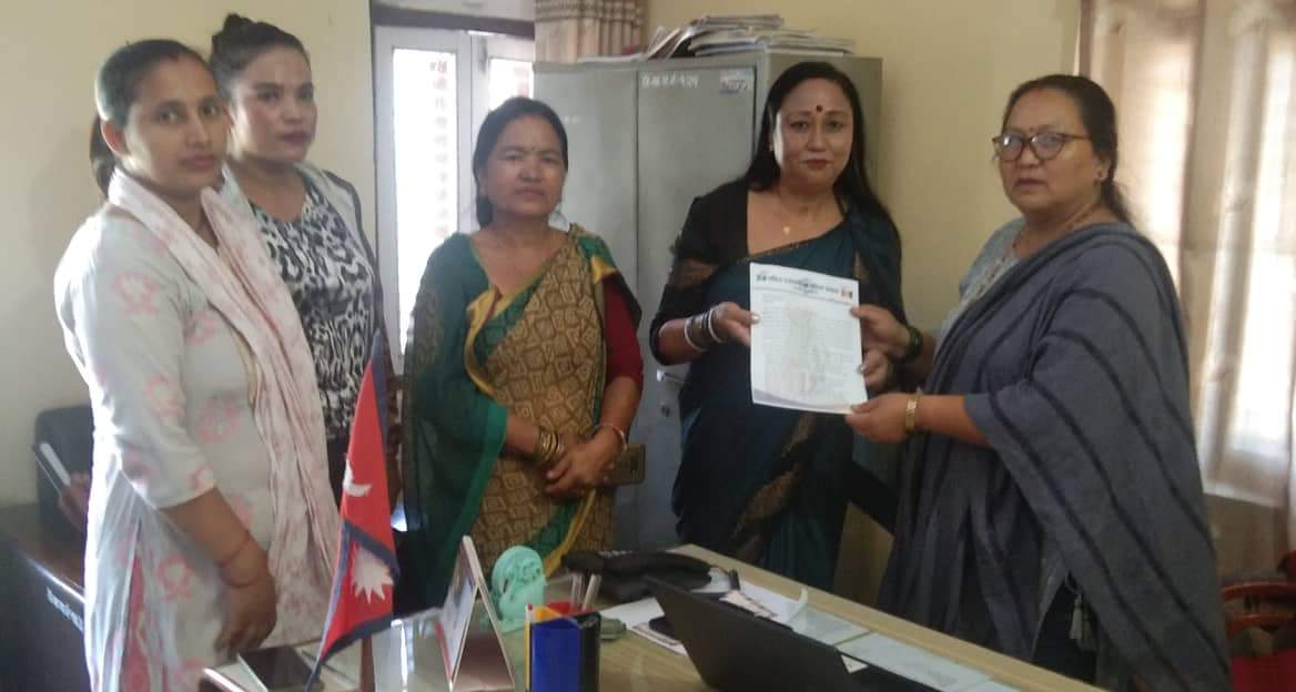 संगठनको ७७ वटै जिल्लामा महिलाको हकहित तथा हिंसा सम्बन्धी ज्ञापन बुझाउने कार्यक्रम अनुसार शुक्रबार जिल्ला अध्यक्ष विनीता गुरुङ थापाको नेतृत्वमा गएको टोलीले प्रमुुख जिल्ला अधिकारी हिरालाल रेग्मी समक्ष ज्ञापनपत्र बुझाएको हो ।
