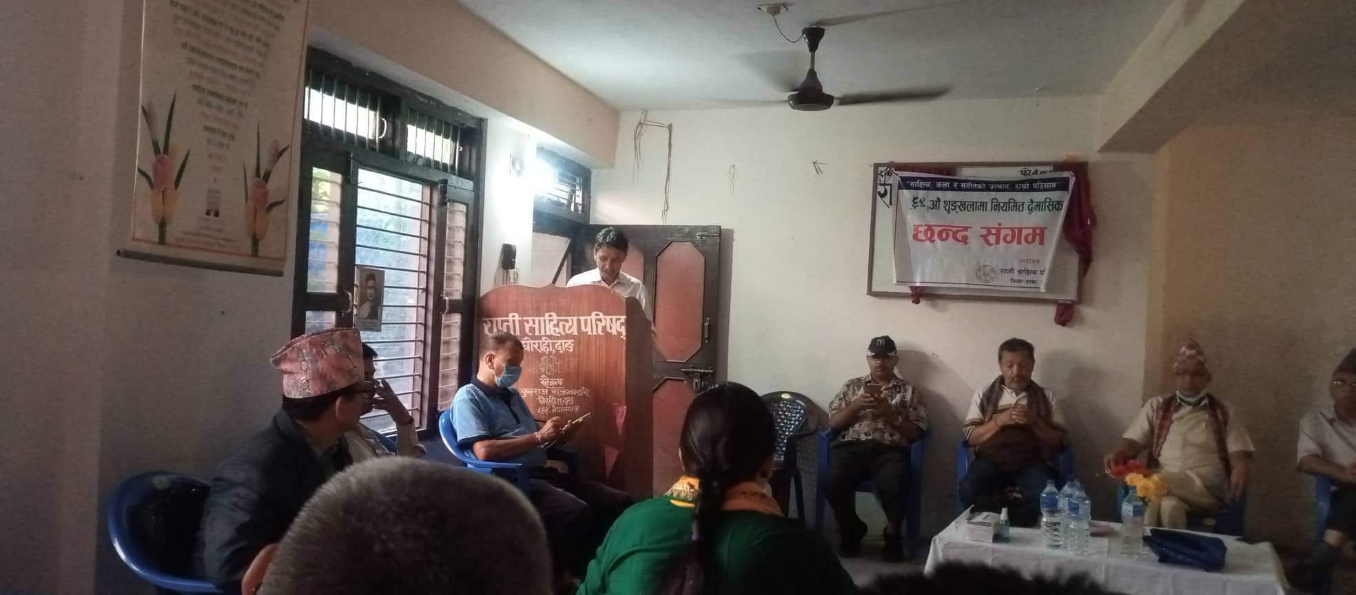 परिषदका जिल्ला अध्यक्ष दीपक शर्मा समीरको अध्यक्षता एवम् वरिष्ठ साहित्यकार गणेश विषमको प्रमुख आतिथ्य तथा परिषदका निवर्तमान केन्द्रीय अध्यक्ष पुरुषोत्तम खनालको विशिष्ट आतिथ्यमा आज एक कार्यक्रम गरी छन्द संगम सम्पन्न गरिएको हो ।