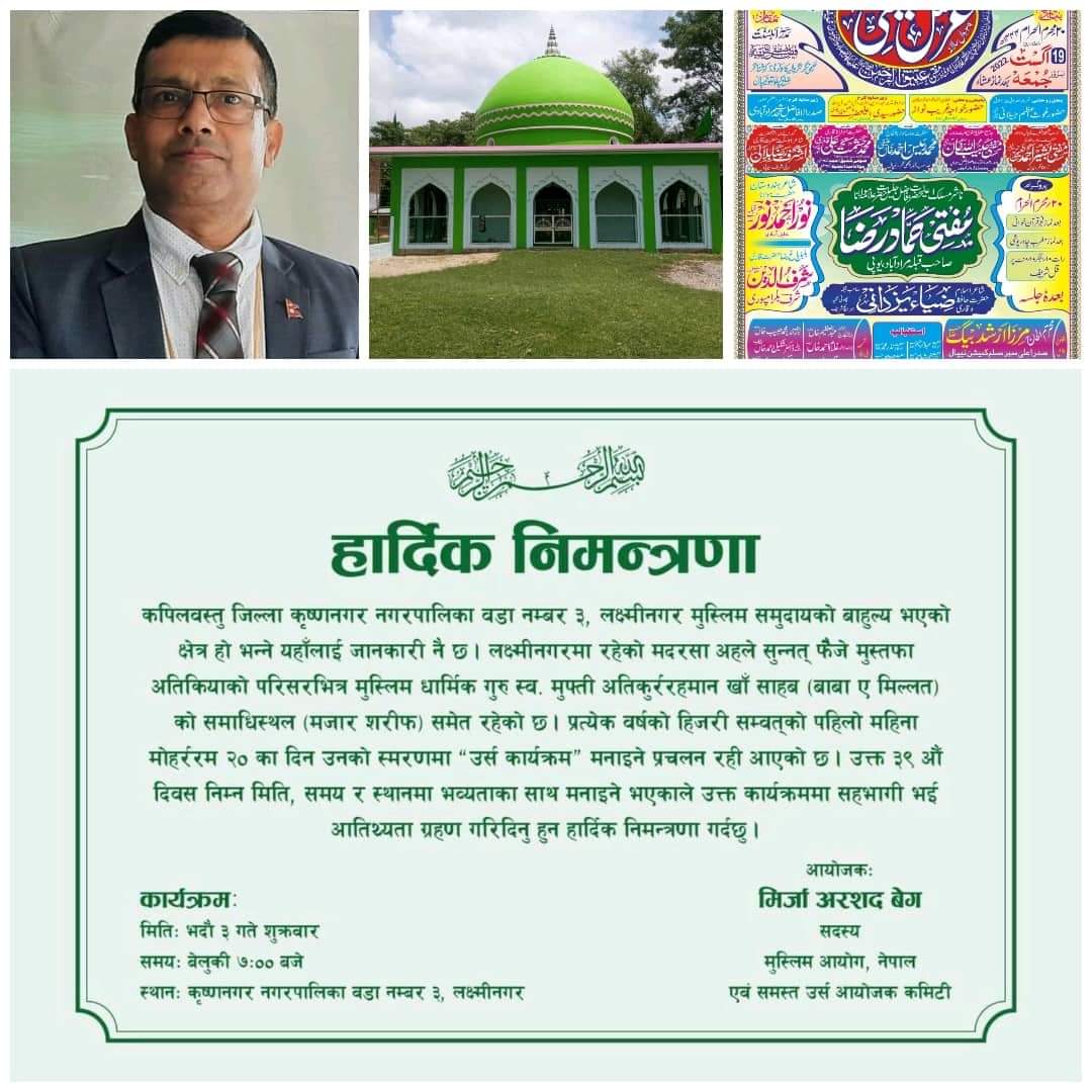 कपिलवस्तु । मुस्लिम आयोगका सदस्य माननीय मिर्जा अरशद बेगले कपिलवस्तु जिल्लाको कृष्णनगर नगरपालिका वडा नम्बर ३ लक्ष्मीनगरमा रहेको धर्मगुरु स्व. मुफ्ती अतिकुर्रहमान खा“ साहब (बाबा ए मिल्लत) को स्मरणमा गरिन लागेको उर्स कार्यक्रममा सहभागी हुन सबैलाई आग्रह गरेका छन् ।