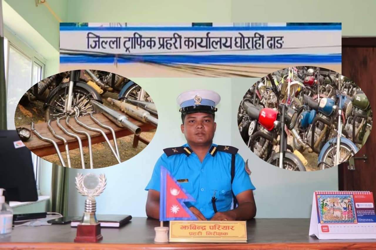 दाङ । जिल्ला ट्राफिक प्रहरी कार्यालय दाङले चर्को आवाज निकाल्ने मोटरसाइकल धमाधम पक्राउ गरी कारबाही सुरु गरेको छ । मोडिफाइ गरिएका र चर्को आवाज निकाल्ने मोटरसाइकल लगाएत सम्पूर्ण सवारी साधनहरुलाई नियन्त्रणमा लिएर कारबाही गर्न सुरु गरिएको जिल्ला ट्राफिक प्रहरी कार्यालय दाङका ट्राफिक प्रमुख प्रहरी निरिक्षक झबिन्द्र परियारले बताए ।