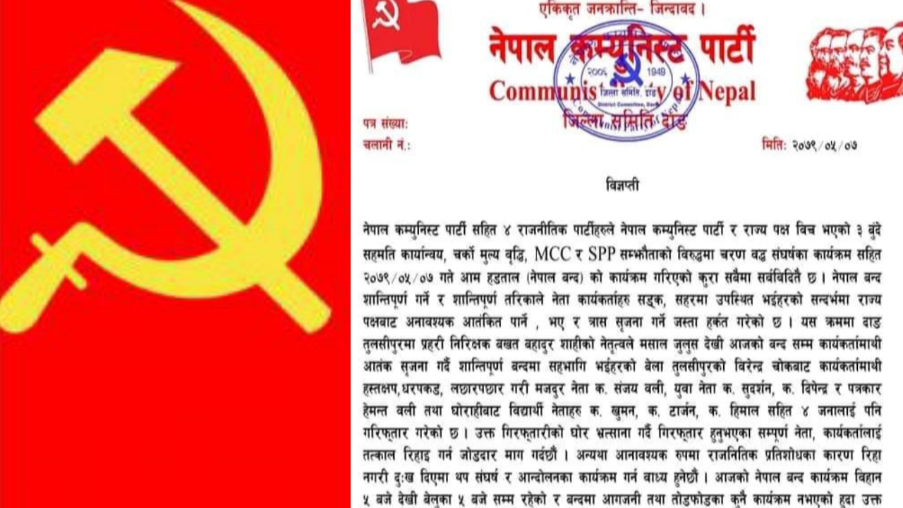 सेक्रेटरी प्रदिपद्धारा जारी विज्ञप्तिमा शान्तिपूर्ण बन्दमा सहभागि भइरहेको बेला तुलसीपुरको विरेन्द्र चोकबाट कार्यकर्तामाथि हस्तक्षेप, धरपकडको, लछार र पछार गरी मजदुर नेता सञ्जय वली, युवा नेता सुदर्शन, दिपेन्द्र र पत्रकार हेमन्त वली तथा घोराहीबाट विद्यार्थी नेताहरू क. सुमन, क. टार्जन, क. हिमाल सहित ४ जनालाई गिरफ्तार गरेको भन्दै गिरफ्तारीको घोर भर्त्सना गर्दै तत्काल रिहाइ गर्न जोडदार माग गरेका छन् । यदि अनावश्यक रूपमा राजनीतिक प्रतिशोधका कारण रिहा नगरी दुःख दिएमा थप संघर्ष र आन्दोलनका कार्यक्रम गर्न वाध्य पनि विज्ञप्तिमा उल्लेख छ ।