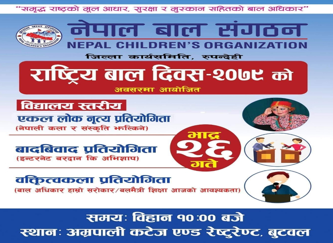 रुपन्देही । नेपाल बाल संगठनले बाल दिवसको अवसरमा विभिन्न रचनात्मक कार्यक्रम गरेर बाल दिवस मनाउने तयारी गरेको छ । नेपाल बाल संगठनले यही भदौ २६ गते विद्यालय स्तरका विभिन्न कार्यक्रम आयोजना गरी मनाउने तयारी गरेको संगठनका अध्यक्ष साजन भण्डारीले जानकारी दिनु भयो ।