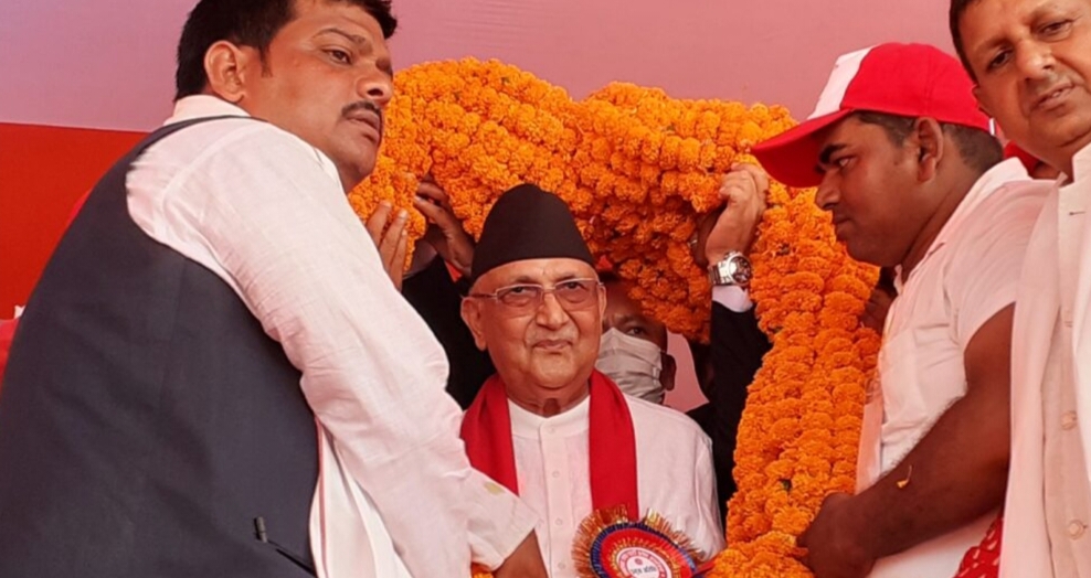 एमाले जिल्ला कमिटीले जनकपुरको तिरहुतिया गाछीमा आयोजना गरेको जनसभा तथा पार्टी प्रवेश कार्यक्रममा सहभागी हुन पुगेका ओलीलाई उक्त माला लगाइएको हो ।