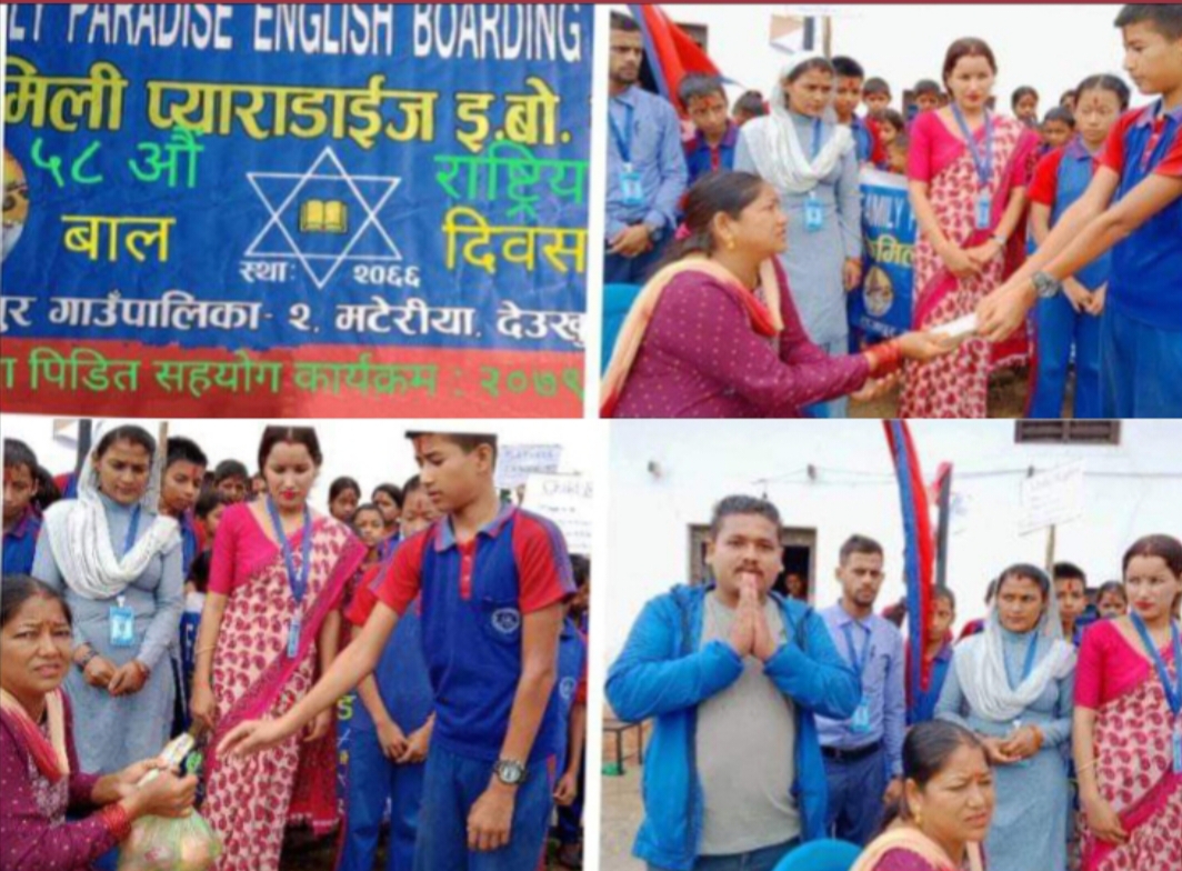 दाङ । लुम्बिनी प्रदेशको राजपुर गाउँपालिका वडा नम्बर २ मटेरिया,देउखुरी दाङमा संचालित फेमिली प्याराडाईज इ. बो. स्कुलका बालबालिकाले ५८ औं राष्ट्रिय बाल दिवस एक कार्यक्रमको आयोजना गरि फरक ढङ्गले मनाएका छन् ।