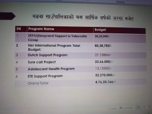 चालु आर्थिक बर्ष २०७९÷०८० का लागि आइ.एस. भिजी. तर्फ ३० लाख २० हजार एचआइपी कार्यक्रम तर्फ ६० लाख ३६ हजार ७ सय ८२,डच सपोर्ट कार्यक्रमतर्फ २७ लाख १३ हजार ८ सय ८४, स्योरकल कार्यक्रम तर्फ २२ लाख ६६ हजार, स्वास्थ्य कार्यक्रम तर्फ १३ लाख १३ हजार ५ सय र शिक्षाद्वारा बिद्यार्थीहरु शसक्तिकरण कार्यक्रम (भ्त्भ् कगउउयचत उचयनचबmmभ) तर्फ ३ करोड २२ लाख ७० हजार गरि यसबर्षको कुल बजेट ४ करोड ७६ लाख २० हजार १ सय ६६ रहेको उक्त कार्यक्रममा सरिता चौधरीले जानकारी गराउनुभएको हो ।