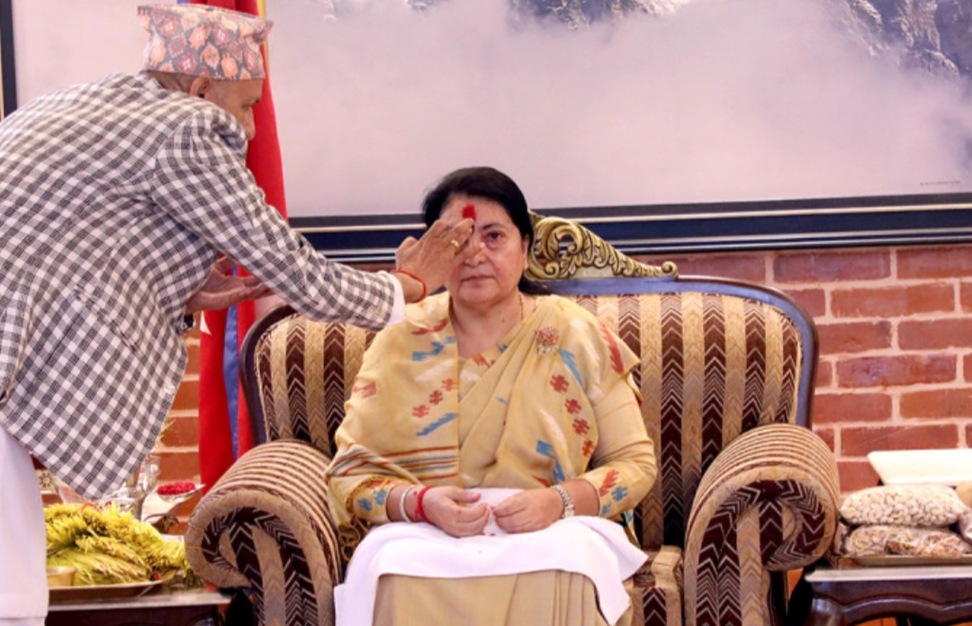 काठमाडौं । राष्ट्रपति विद्यादेवी भण्डारीले गुरुहरू देवराज अर्याल र खेमचन्द्र ढकालको हातबाट बडादशैँको टीका ग्रहण गरेकी छिन् ।