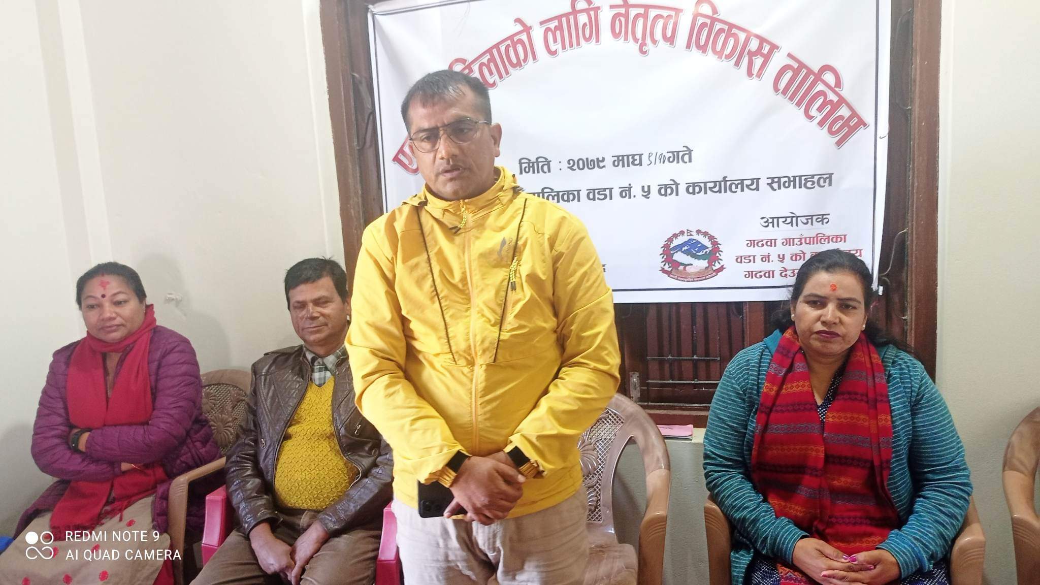 पुस्तकालयका अध्यक्ष ओभा पाठकको अध्यक्षता र वडा अध्यक्ष लेख बहादुर थापाको प्रमुख आतिथ्यमा कार्यक्रम गरिएको हो । कार्यक्रममा बोल्दै वडा अध्यक्ष थापाले एकल महिलाहरुको क्षमता बिकास गर्न र उनिहरुलाई उत्पादनमुखि काममा जोड्न वडा कार्यालयले बजेट बिनियोजन गरेर नेतृत्व बिकास तालिमको आयोजना गरेको बताउनुभयो । एकल महिलाहरुलाई राज्यले दिने सेवा सुविधा संगै सामाजिक क्षेत्रमा नेतृत्वगर्ने क्षमताको बिकास गर्न आवश्यक रहेको थापाले बताउनुभयो । स्थानीय सरकारको तर्फबाट पनि एकल महिलाहरुकोे क्षमता बिकासका लागि बिभिन्न योजनाहरु बनाएर वडा कार्यालयले काम गरिरहेको उहाँले कार्यक्रममा जानकारी गराउनु भयो ।