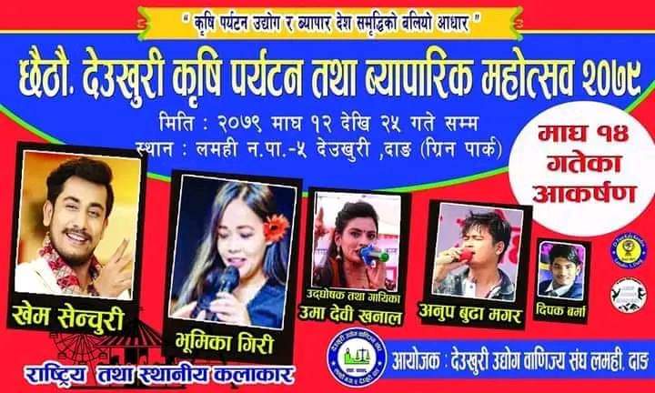 प्रादेशिक औद्यौगिक कृषि, प्रविधि, व्यापार एवं देउखुरीकाे लमहीमा सञ्चालित छैठौ देउखुरी कृषि पर्यटन तथा व्यापारिक महोत्सव २०७९ पर्यटन महोत्सवलाई आज आर्कषक बनाउन गायक खेम सेन्चुरी, गायिका बिन्दु भुमिका गिरी, दिपक बर्मा , अनुप बुढामगर लगाएतका स्थानिय कलाकारहरूकाे आउने भएका देउखुरी उद्योग वाणिज्य संघका उद्योग उपाध्यक्ष तथा सांस्कृतिक समितिका संयोजक केशवराज पोख्रेलले जानकारी दिएका छन् ।