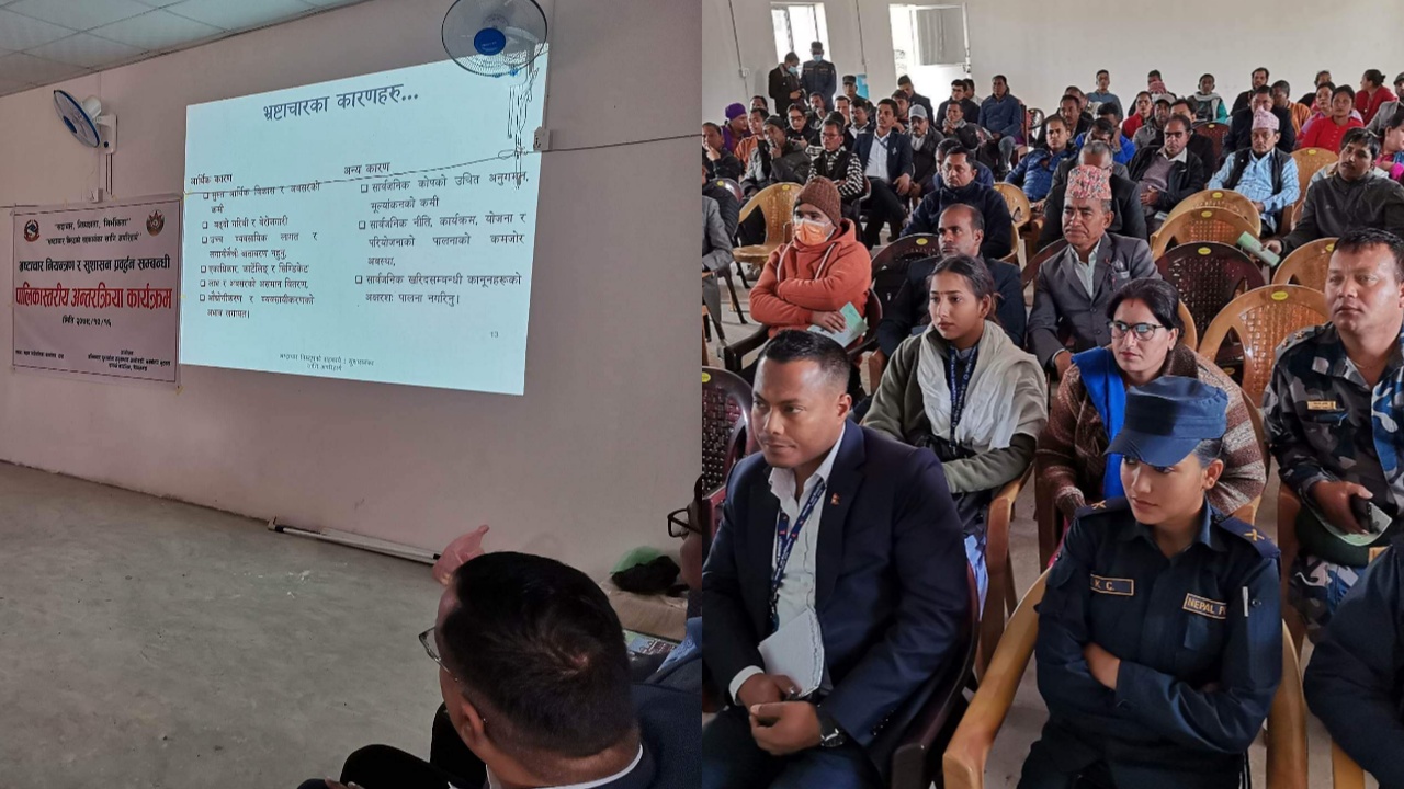 अख्तियार दुरुपयोग अनुसन्धान आयोगको कार्यालय बुटवल, सम्पर्क कार्यालय नेपालगन्जका प्रमुख बिजय राज पौडेलको अध्यक्षता तथा गढवा गाउँपालिका अध्यक्ष यमनारायण शर्मा पोख्रेलको प्रमुख आतिथ्य एवम् गढवा गाउँपालिकाका प्रमुख प्रशासकीय अधिकृत आशिष चौधरी र पुर्व राष्ट्रिय सभा सदस्य मिना बुढाको बिशिस्ट आतिथ्यमा सम्पन्न भएको हो।