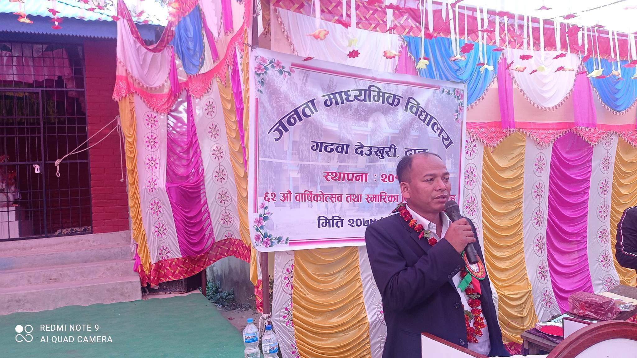 जनता माध्यमिक विद्यालय गढवाको ६२ औं बार्षिकोत्सव समारोहलाई संबोधन गर्दै थारुले यस्तो बताउनु भएको हो । सरकारले बनाएको शिक्षा निती नराम्रो छैन तर हामी आफैले कार्यान्वयन नगर्दा सम्म गुणस्तर सुधार भाषणले मात्र हुदैन । बिश्वको शिक्षा सामुहिक उत्पादनतर्फ जादै गर्दा हाम्रो देश सामन्तबादी चिन्तन संस्कार र मनोबृत्तिबाट माथी नउठ्दा शिक्षामा आमूल परिवर्तन हुन नसकेको र कमिसन कै चक्करमा शिक्षा क्षेत्र रहेको उहाँले बताउनुभयो ।