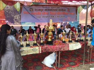 यस्तै राजपुर गाउँपालिका वडा नम्बर ५ का वडा अध्यक्ष टंक बहादुर विष्टले ठुलो लक्ष्य र हाँसिला अनुहार लिएर सहभागि भएका सम्पुर्ण विद्यालयका विद्यार्थी भाइबहिनीहरु र शिक्षकहरूलाई धन्यावाद दिँदै अबका दिनहरू यसरी नै एकताबद्ध खेलकुदको सन्देशलाई जुन आज उत्साहपुर्ण रूपमा मनायौं त्यसरी नै राजपुर गाउँपालिकालाई समृद्ध राजपुर गाउँपालिका सुखी राजपुर बासी बनाउन आत्मसाथ गर्ने आशा आफुले राखेको बताउनु भयो ।