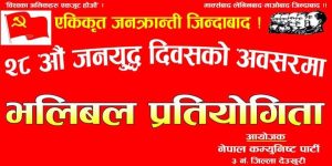 दाङ । नेपाल कम्युनिस्ट पार्टी ३ नम्बर जिल्ला देउखुरीले २८ औं जनयुद्ध दिवसको अवसरपारी बुधबार आदर्श नमूना माध्यमिक विद्यालय देउपुरमा भलिबल प्रतियोगिता कार्यक्रम सम्पन्न गरेको छ ।