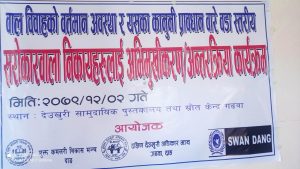वालविबाह न्यूनिकरण र अन्त्यका लागि मुक्त कमलरी बिकास मञ्च दाङले जिल्लाका कैयन स्थानीय पालिकाहरुमा अभियानका रुपमा सचेतना कार्यक्र्रमहरु गर्दै आएको मञ्चका कार्यक्रम संयोजक थापाले जानकारी दिनुभयो ।