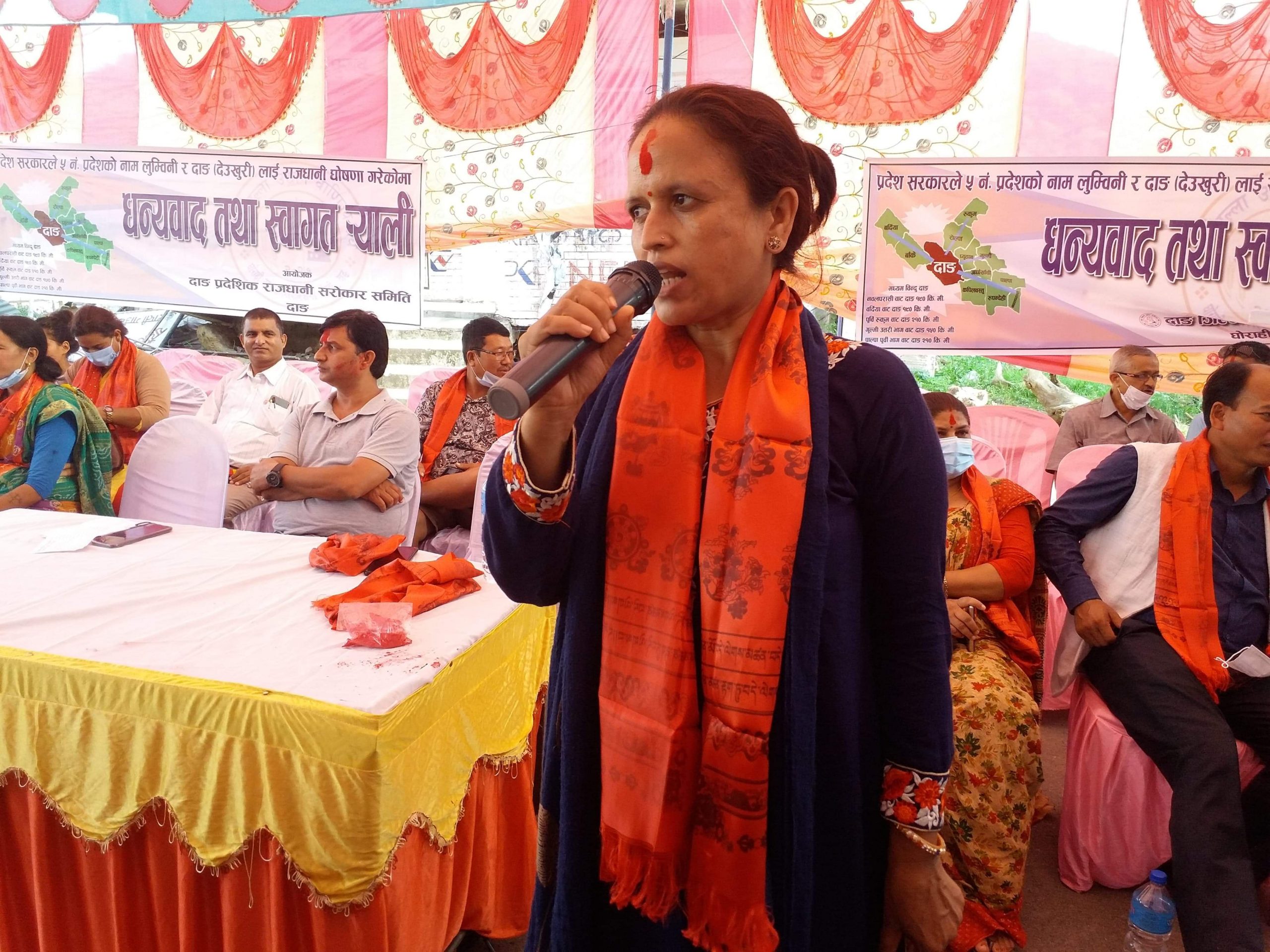 प्रदेश सरकारले ५ नम्बर प्रदेशको नाम लुम्बिनी र दाङ देउखुरीलाई राजधानी घोषणा गरेपछि दाङ प्रादेशिक राजधानी सरोकार समिति दाङले बुधबार भालुवाङमा अायोजना गरेको धन्यवाद तथा स्वागत कार्यक्रममा बोल्दै सो कुरा बताउनु भएको हो । प्रमुख अतिथि समेत रहेकी पुर्व मन्त्री शर्माले अस्थायी राजधानी दाङको बेलझुण्डीमा हुने हल्लाले जग्गा करोवार भयो र त्यसले थुप्रैलाई समस्या पारेको स्मरण गराउँदै पुर्व मन्त्री शर्माले अहिले भइरहेको आन्तरिक जग्गा कारोबार बन्द गरि प्रदेश राजधानीका लागि आवश्यक पर्ने संरचना बनाउन सवैलाई सहयोग गर्न पनि सुझाव दिनु भएको छ ।