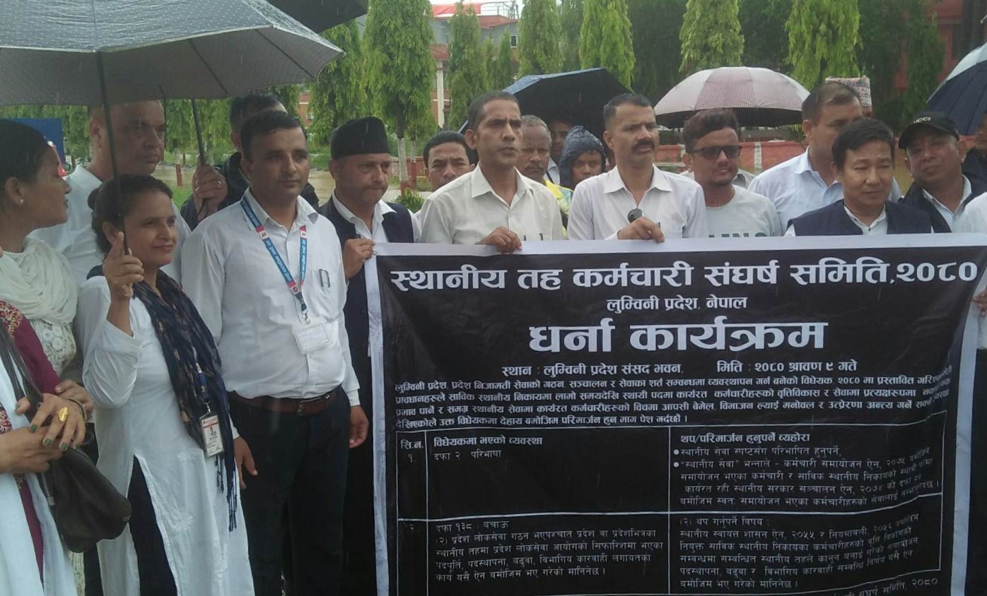 प्रदेश सरकारले ल्याएको निजामति सेवा सम्बन्धी विधेयकमा असन्तुष्टि जनाउँदै १० जिल्लाका १ सय भन्दा बढी स्थानीय तहका कर्मचारीहरुले आज प्रदेशसभा भवनको मुलगेट अगाडी सरकारलाई दबाब दिन धर्ना बसेका हुन् । वर्षातका बाबजुद पनि कर्मचारीहरु धर्ना बसेका हुन् । साविक स्थानीय तहका ३ हजार बढी कर्मचारीहरुको वृत्ति विकासमा प्रत्यक्ष असर पर्ने गरी प्रस्तावित विधेयक ल्याउन लागिएकाले सुधारका लागि दबाब दिन प्रदेशसभा घेराउ गरिएको संघर्ष समितिका संयोजक कृष्णप्रसाद जोशीले बताएका छन् । ‘हामीले मुख्यमन्त्रीज्यूलाई भेटेर पनि अनुरोध गर्यौं, सांसदहरुसँग पनि हारगुहार गरिरहेका छौं’, संयोजक जोशीले भने, ‘सुधारको सुनिश्चितता नभएसम्मका लागि हामी आन्दोलित छौं ।’