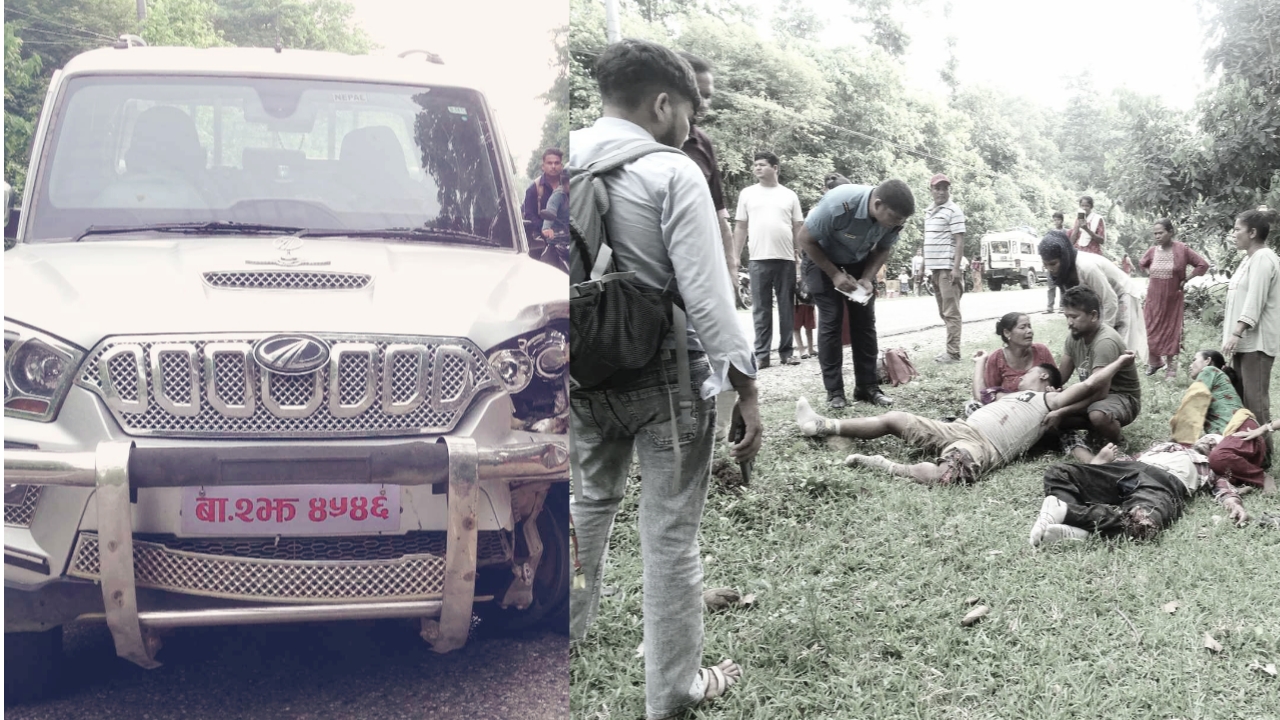 पश्चिमबाट पुर्व जाँदै गरेको सरकारी नम्बर प्लेट भएको बा २ झ ४५४६ नम्बरको महिन्द्रा पिकअप गाडीले पुर्बबाट पश्चिम तर्फ जाँदै गरेको रा ३ प ५५९८ नम्बरको मोटरसाईकललाई ठक्कर दिँदा २ जना गम्भीर घाइते भएका हुन ।