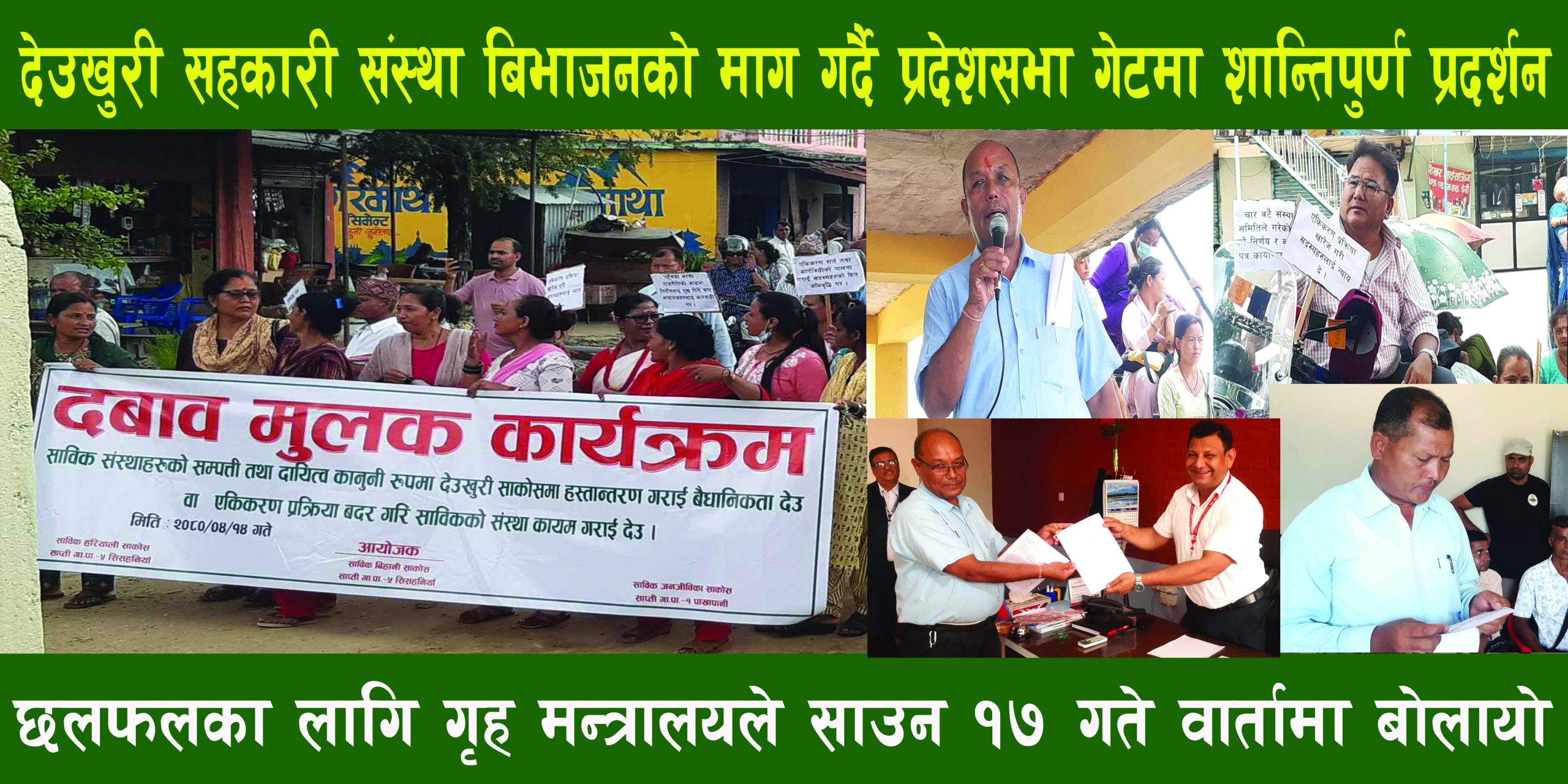 त्यस्तै लामाे समय सम्म पनि सहकारी बिभाजन गर्न सहकारी दर्ता अधिकारी कार्यालयले अस्बीकार गरेपछि साविकका हरियाली, बिहानी र जनजिविका सहकारीका सञ्चालक, सेयर सदस्यहरूले प्रदर्शन गरेका हुन् । उनीहरूले कुनैपनि हालतमा बिभाजन हुनुपर्ने माग गरेका छन् । यसै क्रममा आन्दोलनरत पक्षले गृह मन्त्रालयका सचिव लालबाबु कवाडीलाई ज्ञापनपत्र बुझाएको छ । साविक हरियाली सहकारी संस्थाका अध्यक्ष शिवध्वज मल्लले मन्त्रालयका सचिव कवाडीलाई विभिन्न माग राखि ज्ञापनपत्र बुझाएका छन् ।